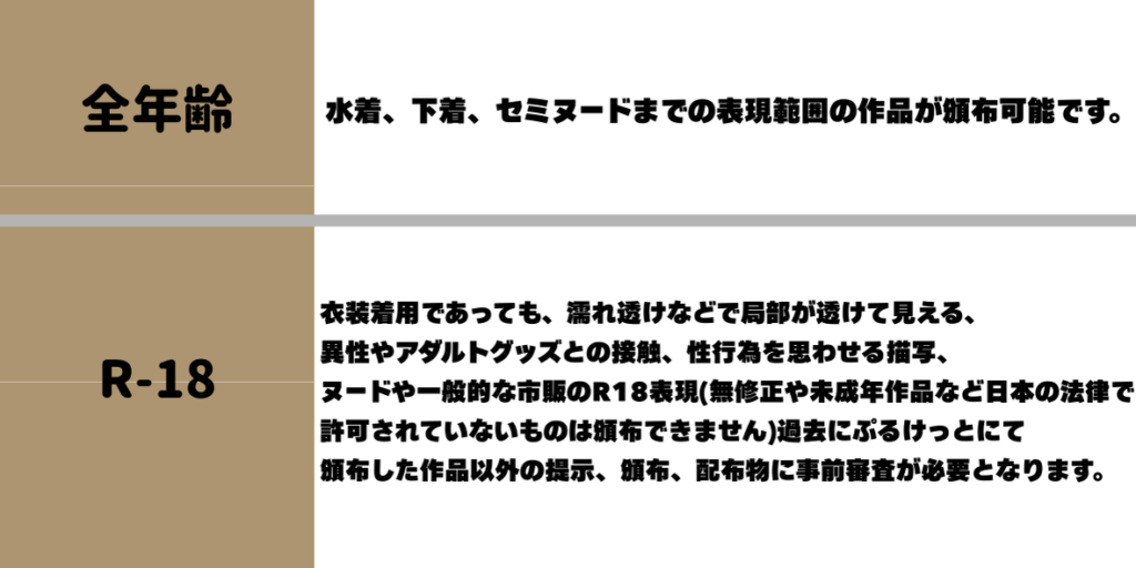 ・R-18作品は全ての頒布物において事前審査が必要です(過去にぷるけっとで頒布許可を出されたものは審査不要)。