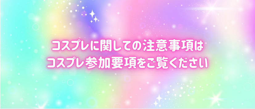 ・「更衣室利用について」「当日着用衣装の禁止事項」「撮影時のポーズについて」「移動時の上着について」はコスプレ参加要項ページを必ずご確認ください。